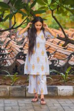 This two-piece ensemble features a light grey cotton kurta and matching straight-fit pants, each adorned with a vibrant floral block print in marigold yellow, teal, and red accents. Its relaxed silhouette, three-quarter sleeves, and side slit pants make it perfect for casual outings, office wear, or relaxed weekend gatherings.