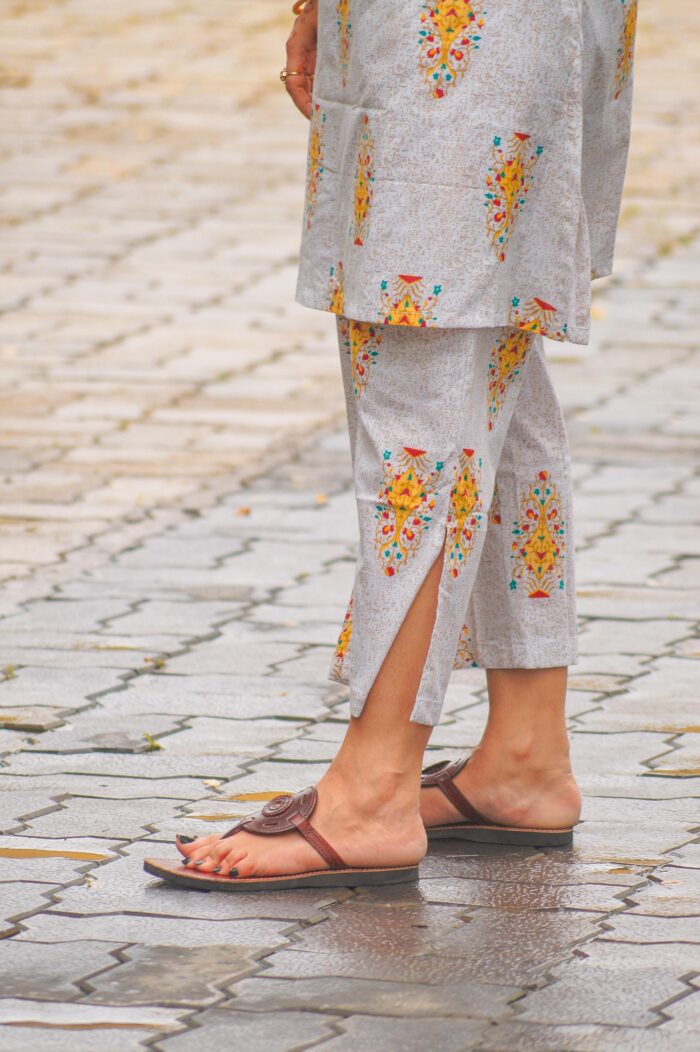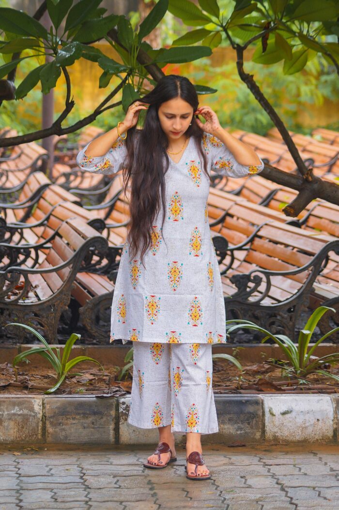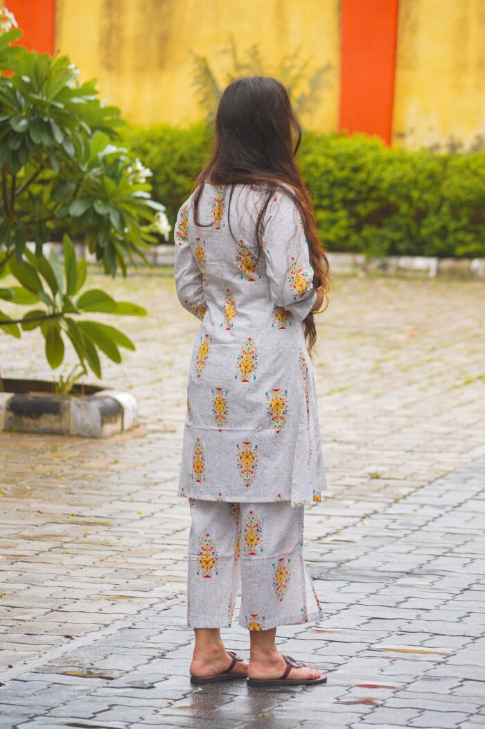 This two-piece ensemble features a light grey cotton kurta and matching straight-fit pants, each adorned with a vibrant floral block print in marigold yellow, teal, and red accents. Its relaxed silhouette, three-quarter sleeves, and side slit pants make it perfect for casual outings, office wear, or relaxed weekend gatherings.