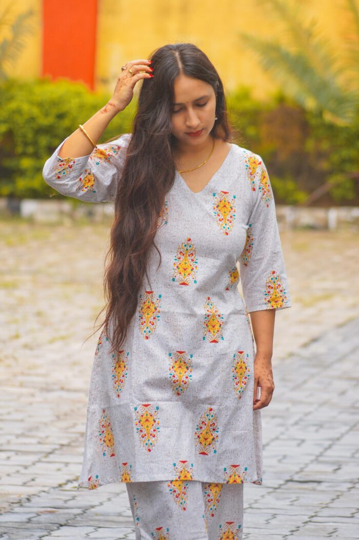 Refresh your everyday ethnic style with the Grey Marigold Printed Cotton Kurta Set — where comfort meets contemporary flair.